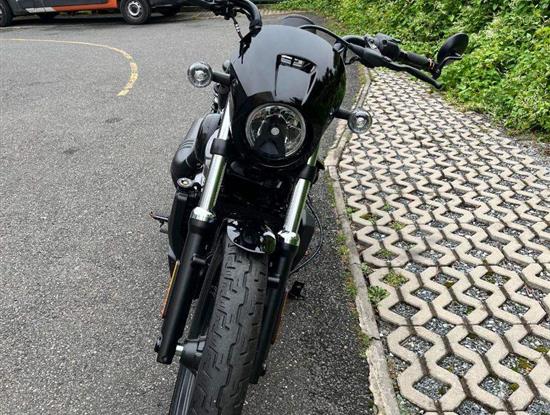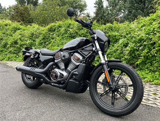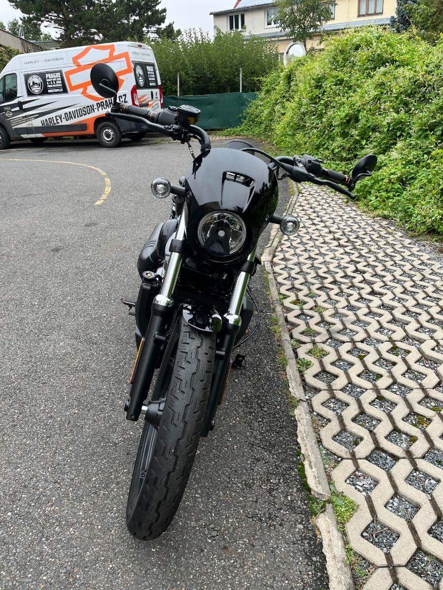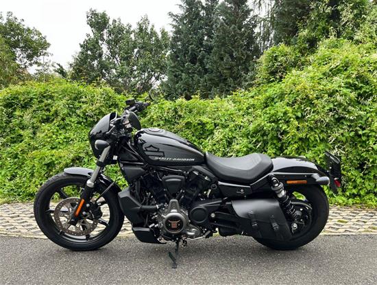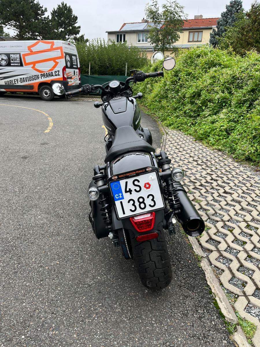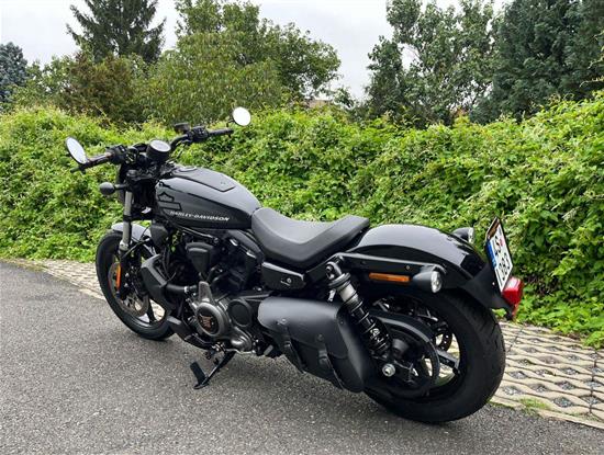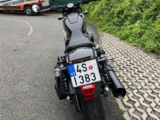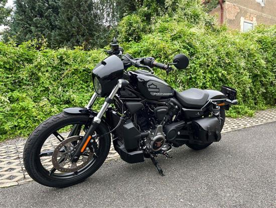 Na motocyklu je nainstalovaná kožená brašna na kyvné vidlici.