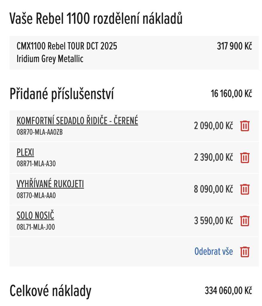 Vložit nový inzerát Upravit Motocykly na prodej Honda CMX 1100 Rebel DCT Touring Přehled Upravit 299 000 Kč Honda CMX 1100 Rebel DCT Touring 2025 Možnost odpočtu DPH. Automatická převodovka. Doplňková výbava: vyhřívané rukojeti, komfortní sedadlo řidiče, solo nosič, vyšší plexi. Perfektní stav. Fantastické svezení. Lehká a živá. Cena nové motorky 334.060 Kč. Odkaz na video motorky: https://youtube.com/shorts/V4Wdmk76mJw Možnost nezávazné prohlídky. první majitel nově přidáno Objem: 1 100 cm3 Vyrobeno: 2025 Najeto: 5 000 km Výkon: 65 kW (88 k) STK: neuvedeno Původ: CZ Výrobce: Honda Model: CMX 1100 Rebel DCT Touring Zařazení: chopper Zobrazeno: 87× Lokalita: Praha, Hlavní město Praha Vloženo: 16.1.2026 Typ inzerátu: bezplatná inzerce Vložit do schránky Nahlásit závadný inzerát Sdílet inzerát Prodávající Telefon: 774310038 E-mail: Odpovedět na inzerát Podobné inzeráty Harley-Davidson XL 1200XS Sportster Forty-Eight Special 2019 Praha 299 000 Kč Indian Scout 2022 Olomoucký dohodou Harley-Davidson XL 1200N Sportster 1200 Nightster 2009 Praha 185 000 Kč Harley-Davidson XL 1200V Sportster Seventy-Two 2013 Liberecký 230 000 Kč Honda VTX 1300 2008 Praha 159 000 Kč Harley-Davidson VRSCAW V-Rod 2003 Moravskoslezský 320 000 Kč Harley-Davidson RH 975T Nightster 2022 Praha 270 000 Kč Harley-Davidson XL 1200 C Sportster Custom 2006 Praha 180 000 Kč Harley-Davidson XL 1200V Sportster Seventy-Two 2013 Praha 250 000 Kč Honda Rebel 1100 Plzeňský 274 000 Kč Yamaha XV 950 Racer 2016 Jihočeský 159 000 Kč Harley-Davidson XL 1200 C Sportster Custom 2011 Královéhradecký 255 000 Kč Yamaha XVS 950 A Midnight Star 2013 Královéhradecký 155 000 Kč BMW R 1200 C 1998 Královéhradecký 175 000 Kč Harley-Davidson XL 1200X Sportster Forty-Eight 2017 Středočeský 279 000 Kč Honda Rebel1100 DCT Plzeňský 288 900 Kč Honda VTX 1300 2011 Královéhradecký 265 000 Kč Honda VTX 1300 2013 Královéhradecký 275 000 Kč Kawasaki VN 900 Classic 2009 Královéhradecký 175 000 Kč Harley-Davidson VRSCA V - ROD 2005 Královéhradecký 230 000 Kč