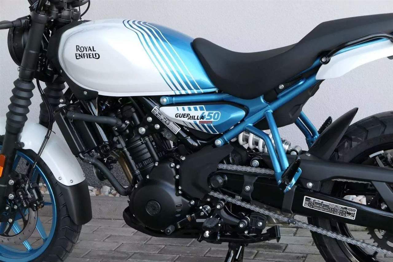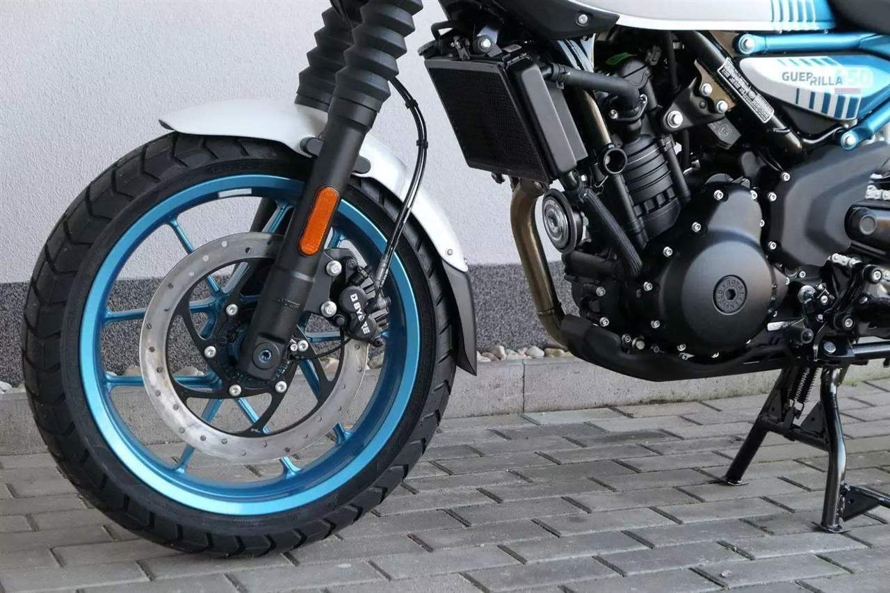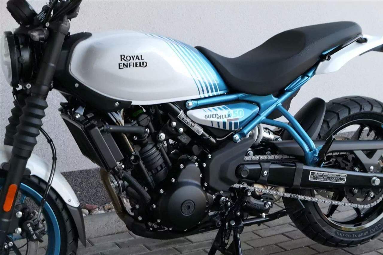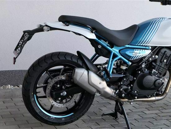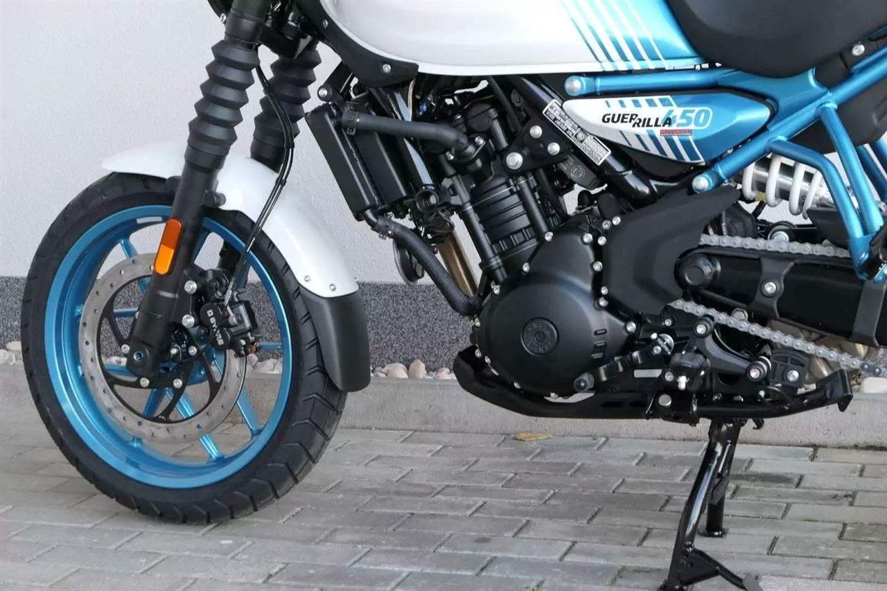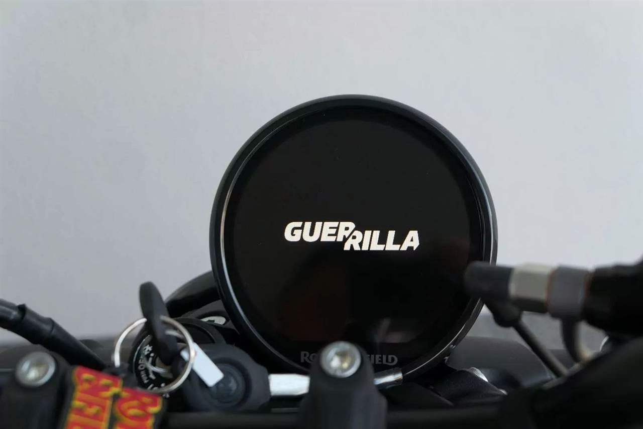 Z dosavadní modelové řady má Guerilla nejblíž Hunteru, působí ale moderněji a má i výrazně modernější techniku. Tak jako u aktuálního silnějšího Himalayanu 450 tvoří základ motorky trubkový páteřový rám, a v něm jako nosný prvek kapalinou chlazený jednoválec Sherpa o objemu 452 cm3. Relativně nový čtyřventil je mnohem výkonnější jednotkou než starší a menší vzduchem chlazené agregáty. Konkrétně nabídne rovných 40 koní v 8 000 otáčkách, a aby se to dobře pamatovalo tak i 40 Nm, které vrcholí v 5 500 otáčkách. Motor už má elektronický plyn a díky tomu i volitelné jízdní režimy – je ale poměrně jasné, který z dvojice „Eco“ a „Performance“ drtivá většina jezdců zvolí.