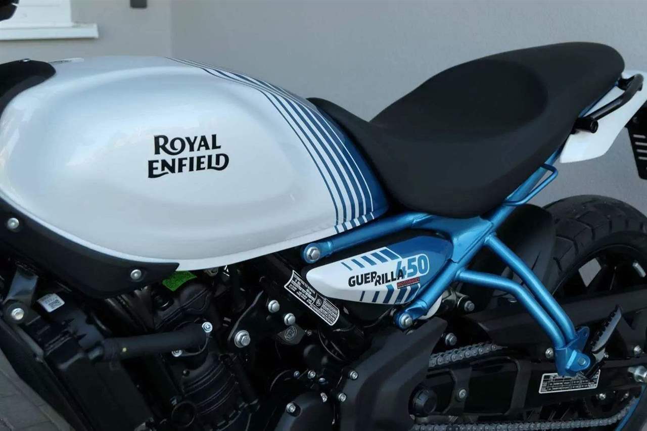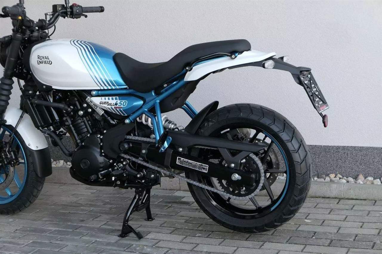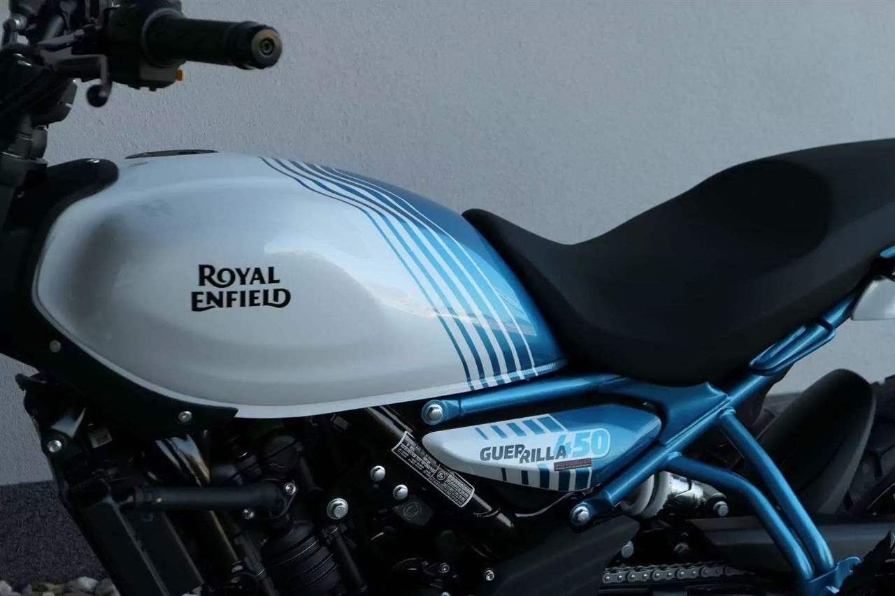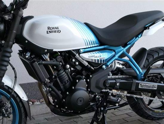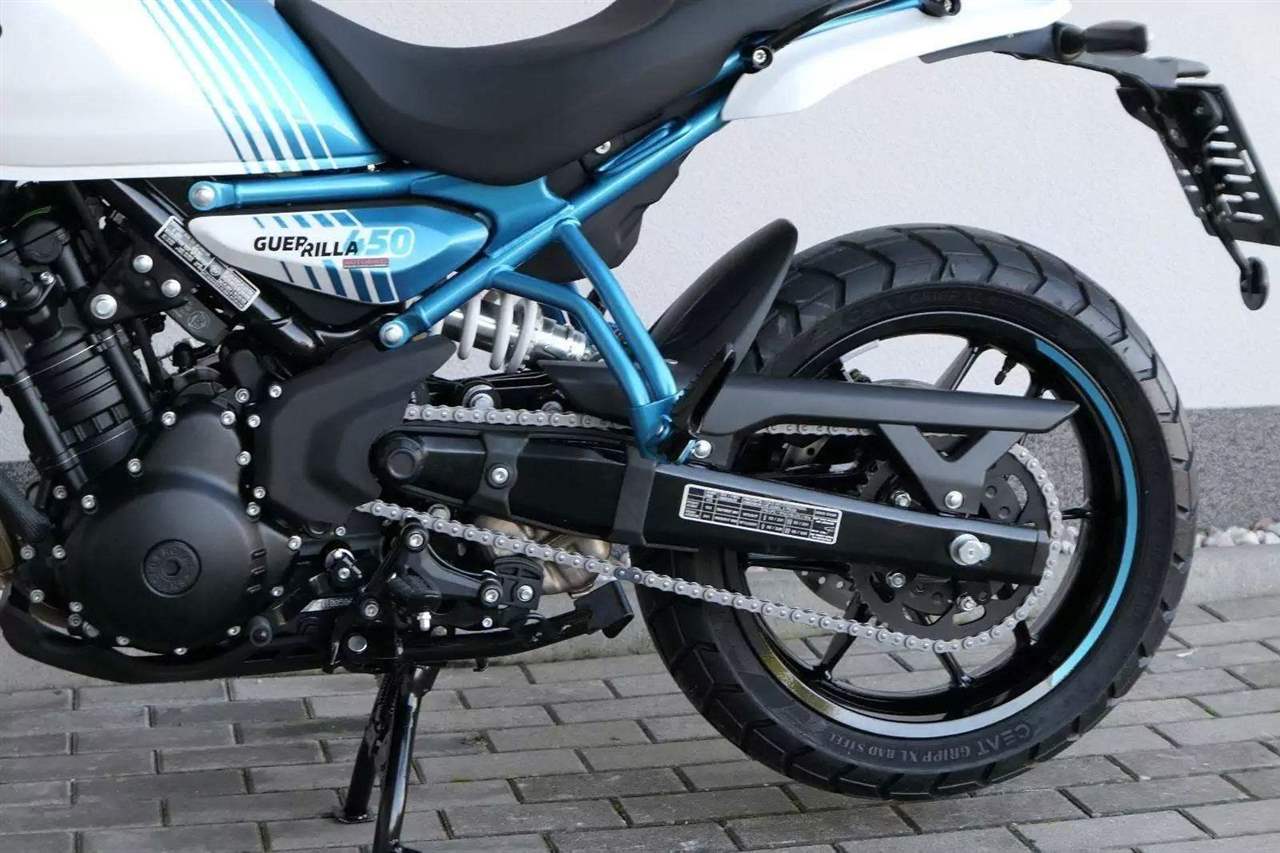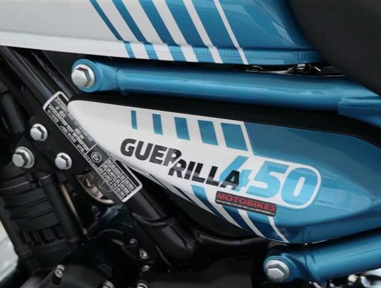 Z dosavadní modelové řady má Guerilla nejblíž Hunteru, působí ale moderněji a má i výrazně modernější techniku. Tak jako u aktuálního silnějšího Himalayanu 450 tvoří základ motorky trubkový páteřový rám, a v něm jako nosný prvek kapalinou chlazený jednoválec Sherpa o objemu 452 cm3. Relativně nový čtyřventil je mnohem výkonnější jednotkou než starší a menší vzduchem chlazené agregáty. Konkrétně nabídne rovných 40 koní v 8 000 otáčkách, a aby se to dobře pamatovalo tak i 40 Nm, které vrcholí v 5 500 otáčkách. Motor už má elektronický plyn a díky tomu i volitelné jízdní režimy – je ale poměrně jasné, který z dvojice „Eco“ a „Performance“ drtivá většina jezdců zvolí.