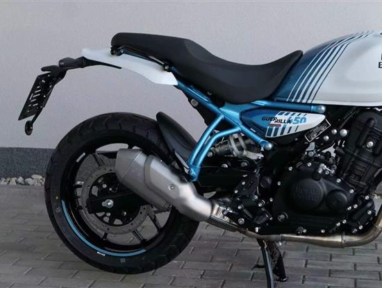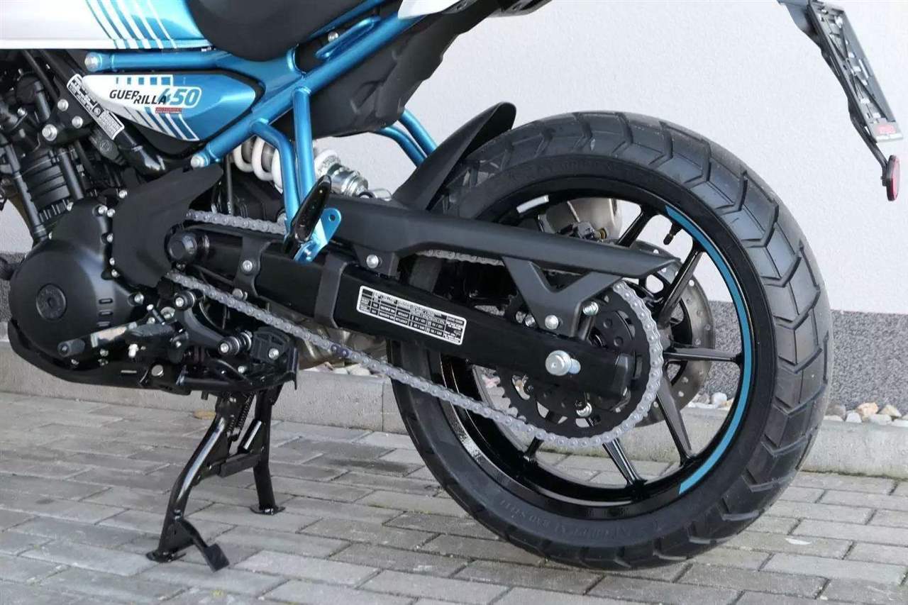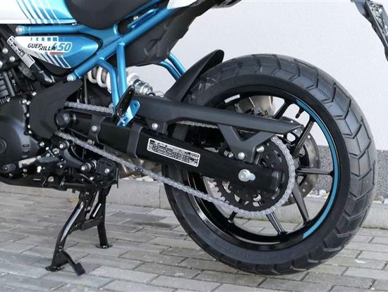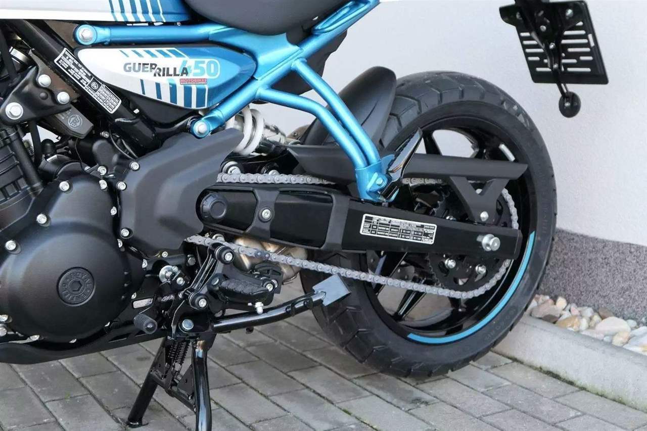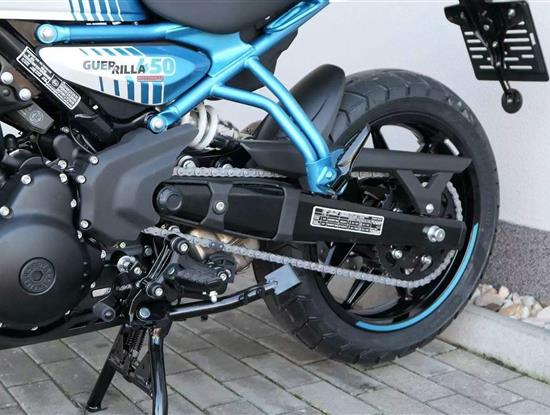 Kola jsou sedmnáctipalcová a Guerilla se chlubí přístupnou výškou sedla 780 milimetrů, stejně jako příjemnou pohotovostní hmotností 184 kilogramů. S ohledem na výkon a hmotnost jsou celkem dostačující i brzdy – vpředu jeden kotouč 310 milimetrů s dvoupístkovým brzdičem, vzadu 270 milimetrů s jednopístem. Do nádrže se vejde jenom skromných 11 litrů, na druhou stranu výrobce uvádí i skromnou tabulkovou spotřebu 3,39 litru na 100 kilometrů.