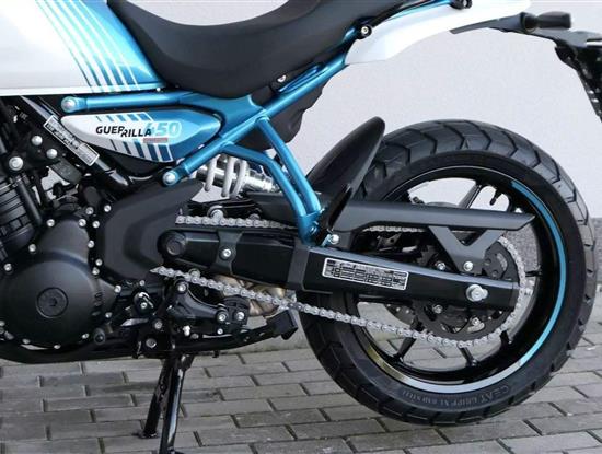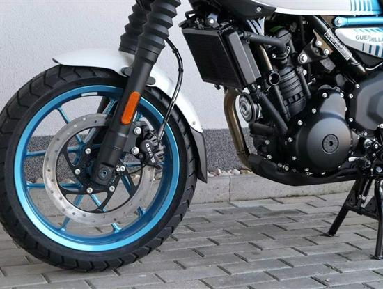Na rozdíl od Himalayanu, nedělá si Guerrilla terénní ambice, byť některými prvky decentně připomíná, že je vlastně naháčo-scrambler – ve všech tiskových materiálech se pak objevuje populární termín „roadster“. Na teleskopických vidlicích jsou třeba prďácké retro prachovky, nicméně zdvih je jenom 140 milimetrů. Zadní vyosený centrál má potom 150 milimetrů.