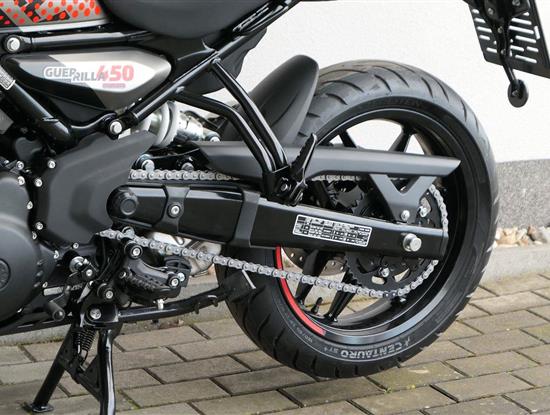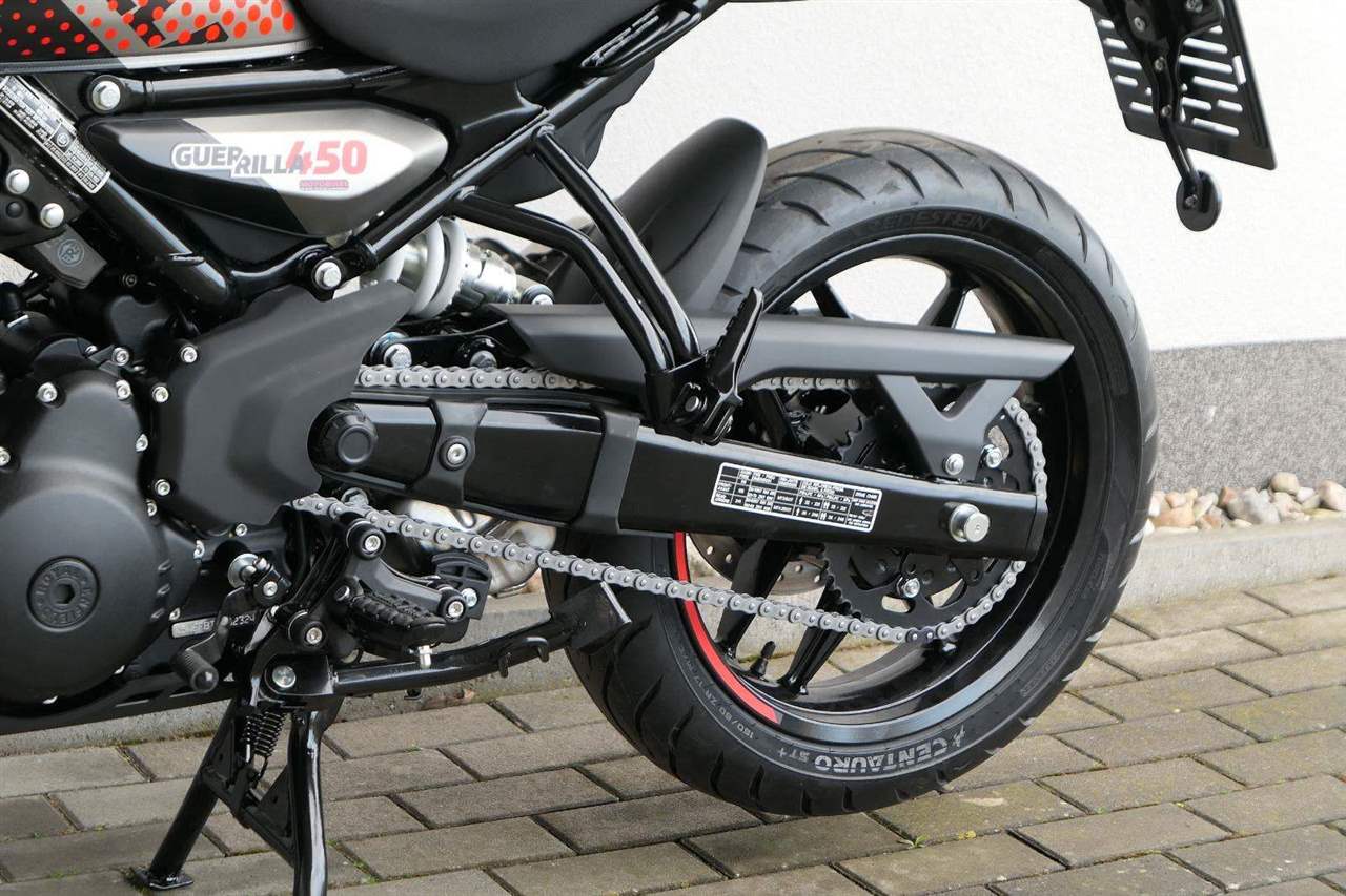 Guerrilla 450 je postavená jako silniční roadster bez terénních ambicí, i když designově lehce odkazuje na scrambler.