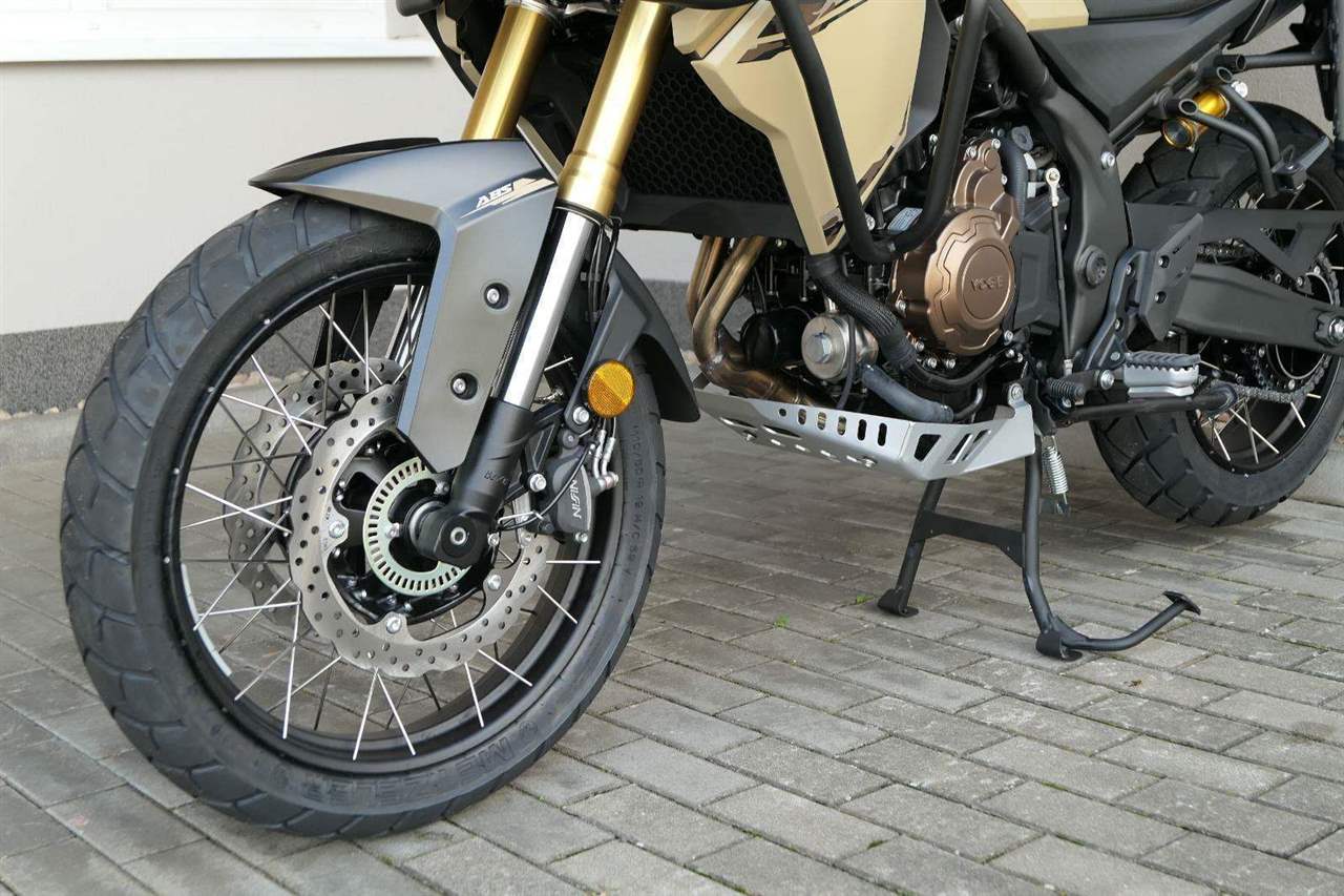 Těšit se můžeš taky na plexi, který si z místa řidiče bez nářadí nastavíš do dvou poloh. Oceníš i hliníkovej kryt motoru, LED světla včetně přídavnejch bodovek, boční i středovej stojan a hafo další výbavičky. Jo, a nově mám taky podsvícený ovladače na řídítkách, takže už žádný tápání ve tmě.