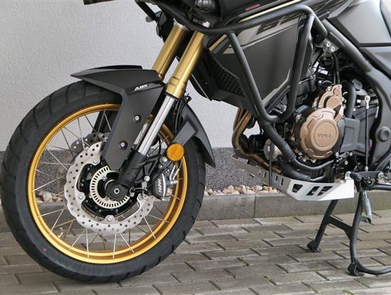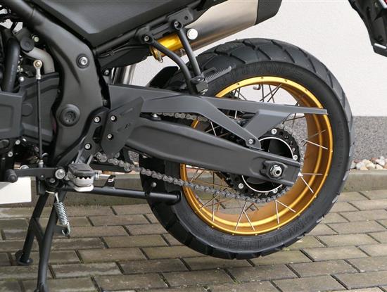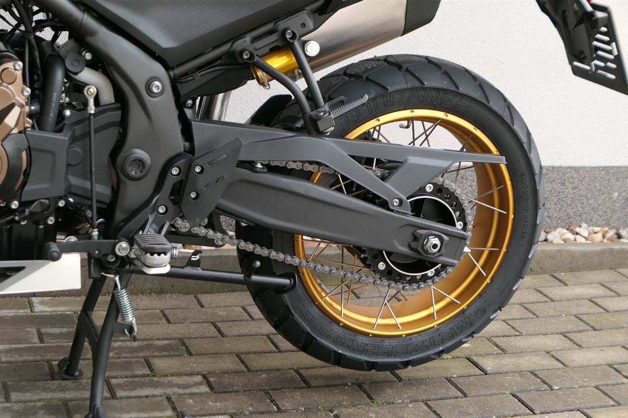 Na fešnejch drátěnejch kolech mám obutý bezdušový gumy Metzeler Tourance. Naprostej spoleh je na topový brzdy od japonskýho Nissinu. Pomocí dvou jízdních režimů mi snadno poručíš, jestli dáme piánko, nebo přitvrdíme v režimu sport.