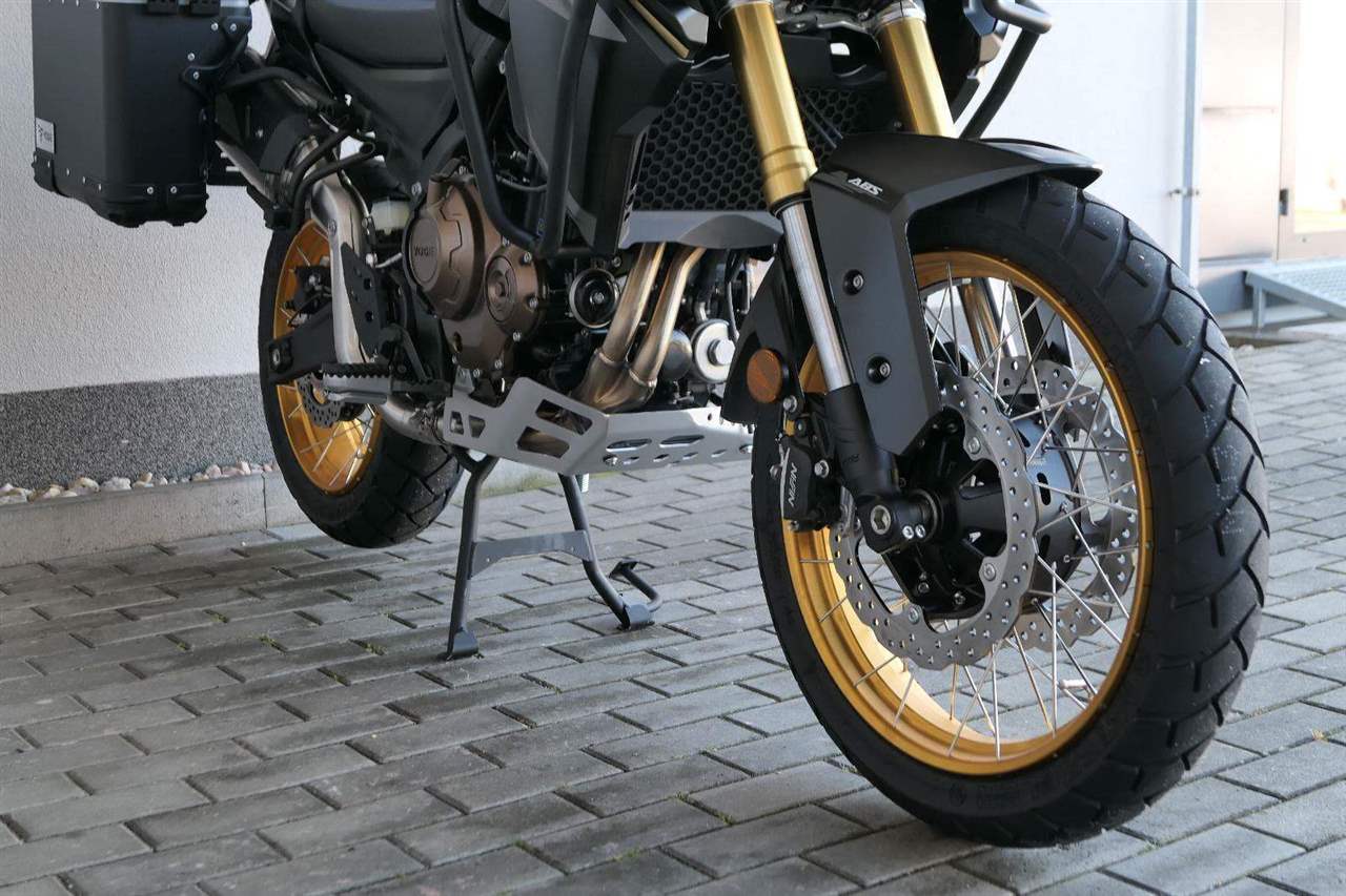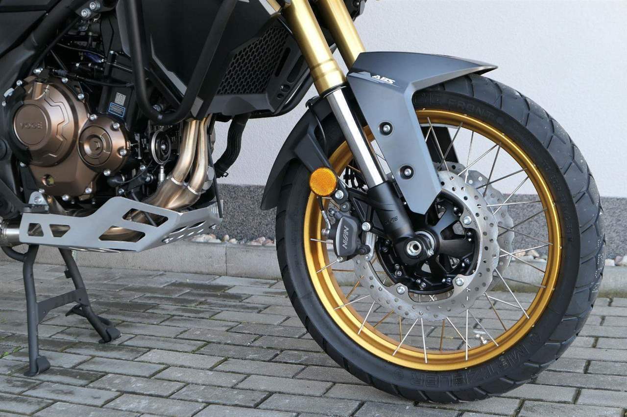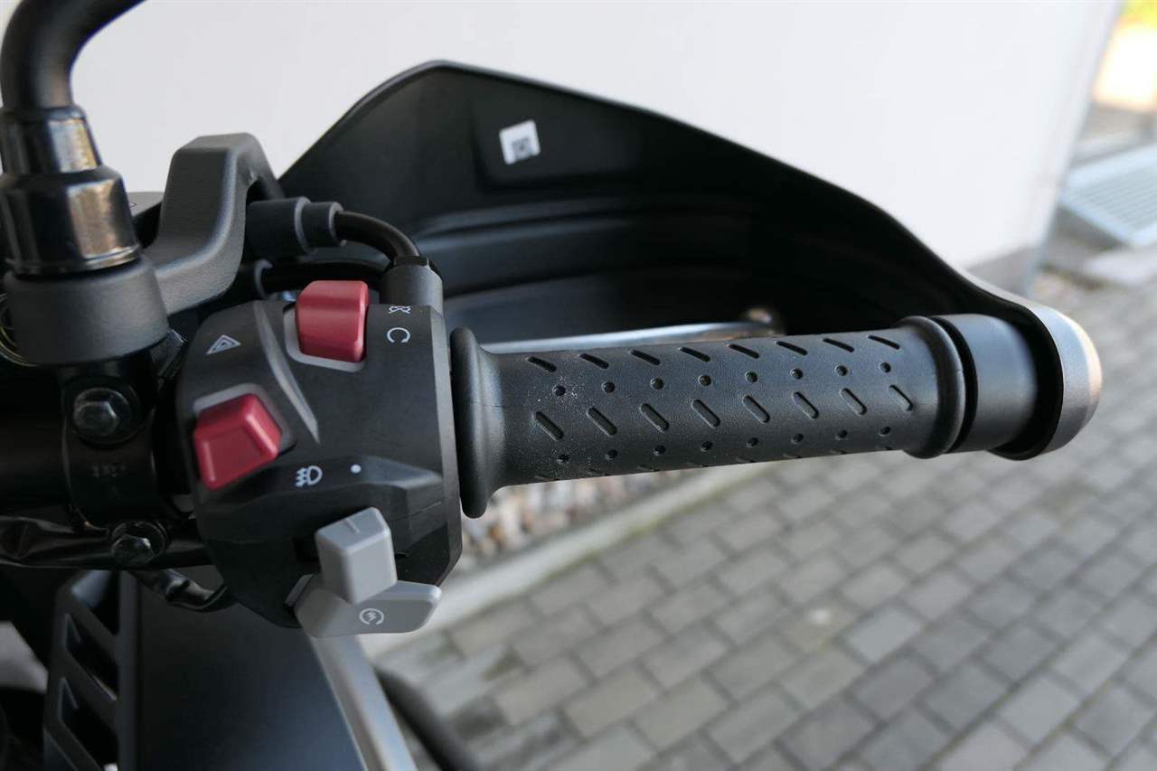Na fešnejch drátěnejch kolech mám obutý bezdušový gumy Metzeler Tourance. Naprostej spoleh je na topový brzdy od japonskýho Nissinu. Pomocí dvou jízdních režimů mi snadno poručíš, jestli dáme piánko, nebo přitvrdíme v režimu sport.