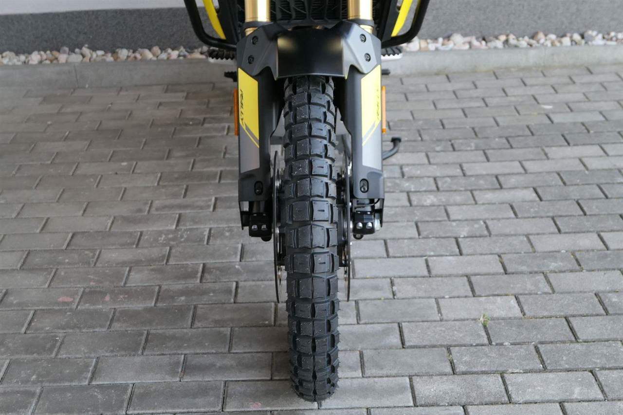 Offroadový kola jak zákon káže. Vpředu najdeš jednadvacítku, vzadu osmnáctku – prostě offroad klasika. Kola jsou samozřejmě drátový a bezdušový. Na ráfkách dostaneš gumy Pirelli Scorpion Rally STR, který si hravě poraděj jak s asfaltem, tak s terénem.
