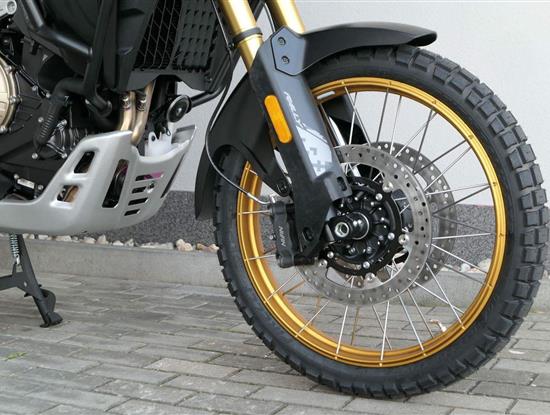 Vpředu najdeš jednadvacítku, vzadu osmnáctku – prostě offroad klasika. Kola jsou samozřejmě drátový a bezdušový. Na ráfkách dostaneš gumy Pirelli Scorpion Rally STR, který si hravě poraděj jak s asfaltem, tak s terénem.