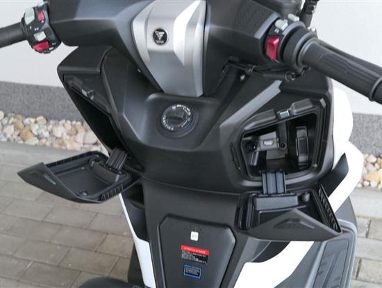 K tomu integrovaná palubní kamera s detektorem nárazu, kterej automaticky uloží záznam při nehodě. Elektrika je fajn, ale při brzdění spolíhám na starý dobrý železo, tedy dvoupístkový třmeny a kotouče. Ten vpředu má průměr 260 mm, zadní 240 mm. Na skútr slušný, co říkáš?
