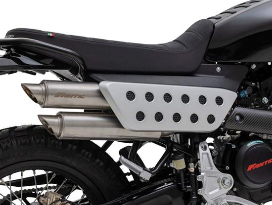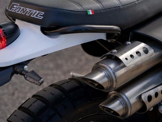 Přední 41mm USD vidlice FANTIC FRS má zdvih 150 mm, zadní odpružení se stejným zdvihem je také tovární FANTIC FSR. U verze Scrambler je nastavitelný odskok u zadního tlumiče.