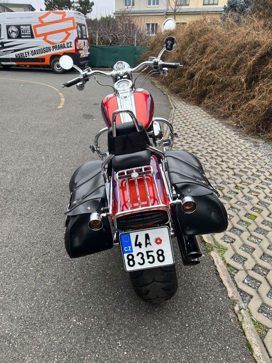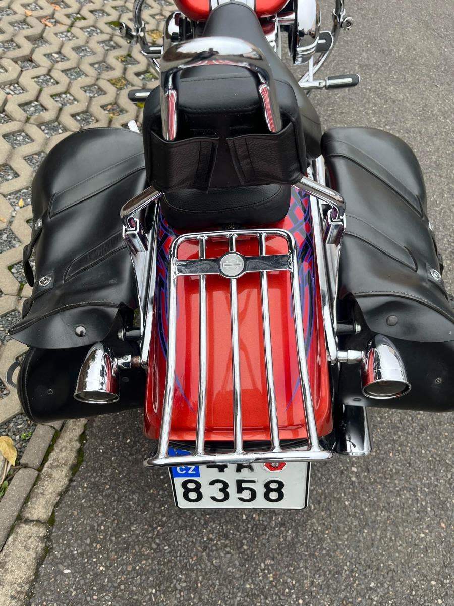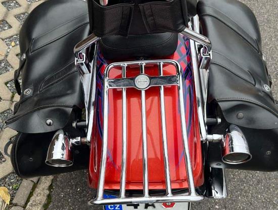 Kožené brašny, chromovaná opěrka spolujezdce a nosič na zadním blatníku.