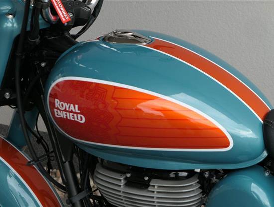 „Trip Teal Green“ s oranžovými akcenty evokujícími ducha Goan moto-kultury.