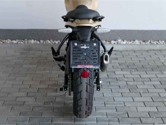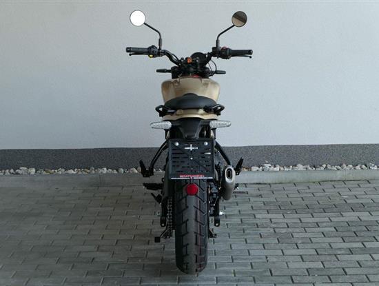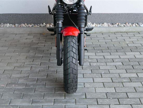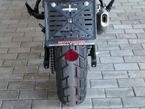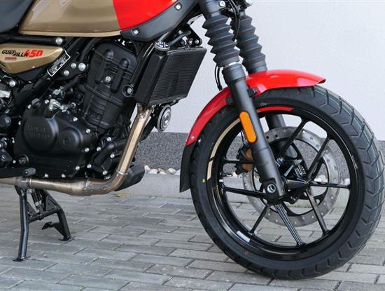 Na rozdíl od Himalayanu, nedělá si Guerrilla terénní ambice, byť některými prvky decentně připomíná, že je vlastně naháčo-scrambler – ve všech tiskových materiálech se pak objevuje populární termín „roadster“. Na teleskopických vidlicích jsou třeba prďácké retro prachovky, nicméně zdvih je jenom 140 milimetrů. Zadní vyosený centrál má potom 150 milimetrů.