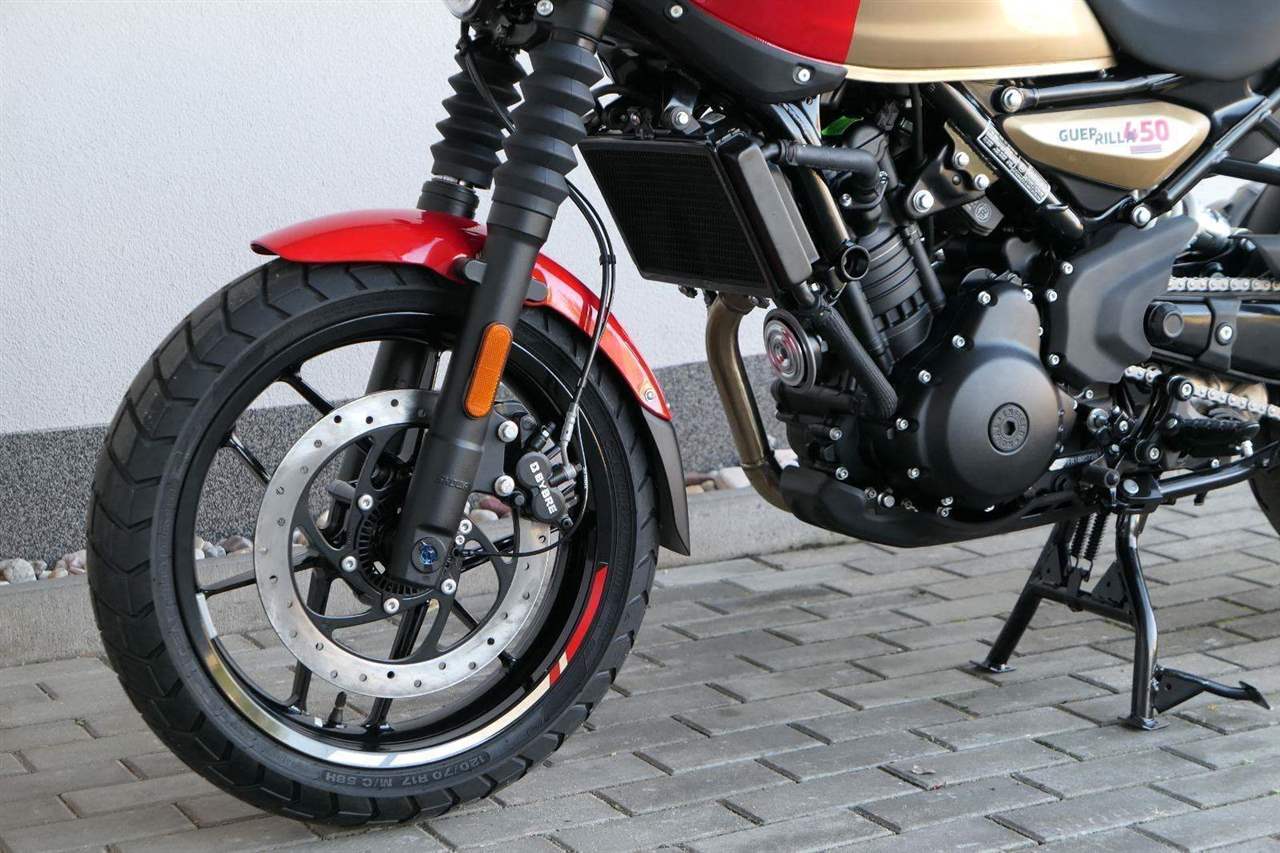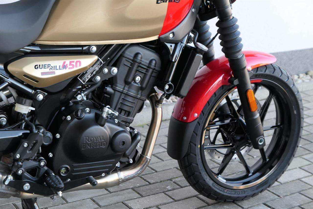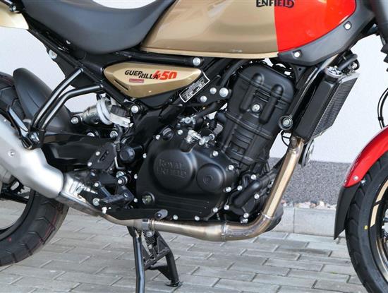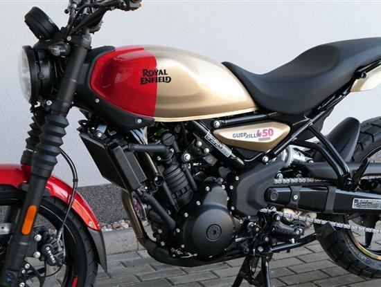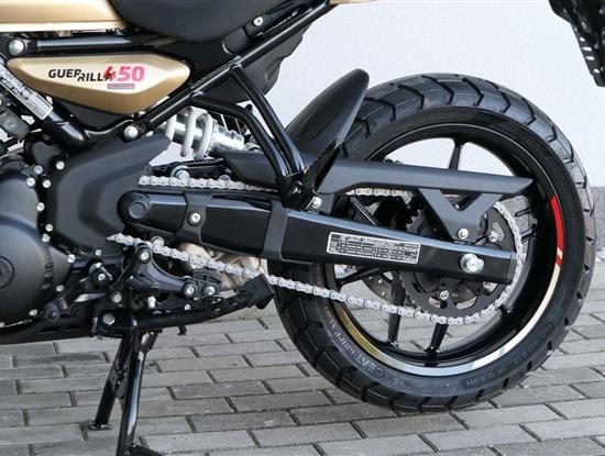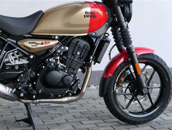 Z dosavadní modelové řady má Guerilla nejblíž Hunteru, působí ale moderněji a má i výrazně modernější techniku. Tak jako u aktuálního silnějšího Himalayanu 450 tvoří základ motorky trubkový páteřový rám, a v něm jako nosný prvek kapalinou chlazený jednoválec Sherpa o objemu 452 cm3. Relativně nový čtyřventil je mnohem výkonnější jednotkou než starší a menší vzduchem chlazené agregáty. Konkrétně nabídne rovných 40 koní v 8 000 otáčkách, a aby se to dobře pamatovalo tak i 40 Nm, které vrcholí v 5 500 otáčkách. Motor už má elektronický plyn a díky tomu i volitelné jízdní režimy – je ale poměrně jasné, který z dvojice „Eco“ a „Performance“ drtivá většina jezdců zvolí.