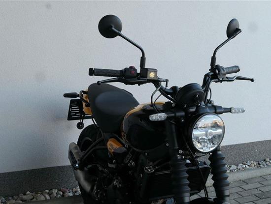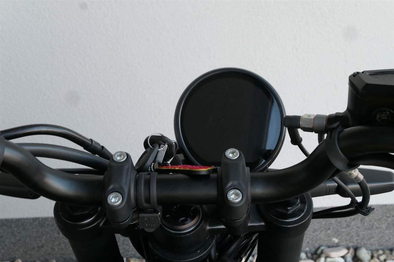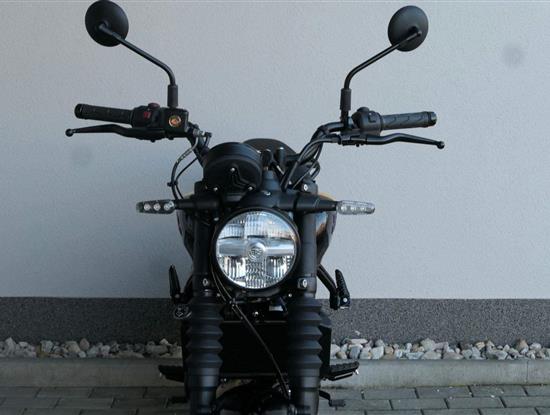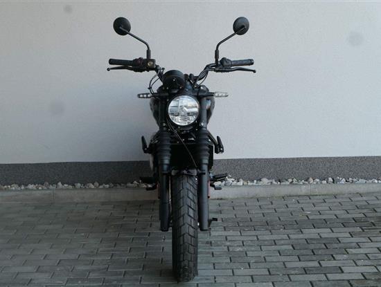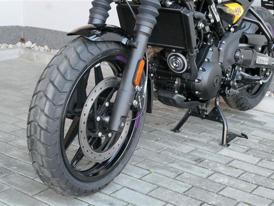 Na rozdíl od Himalayanu, nedělá si Guerrilla terénní ambice, byť některými prvky decentně připomíná, že je vlastně naháčo-scrambler – ve všech tiskových materiálech se pak objevuje populární termín „roadster“. Na teleskopických vidlicích jsou třeba prďácké retro prachovky, nicméně zdvih je jenom 140 milimetrů. Zadní vyosený centrál má potom 150 milimetrů.
