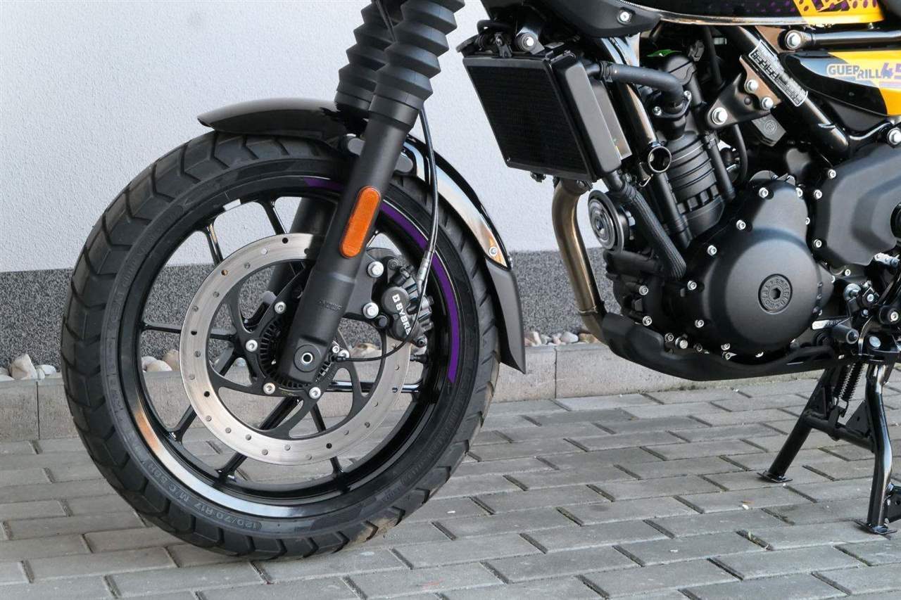 Royal Enfield Guerrilla 450 sdílí motor a technický základ s cestovním endurem Himalayan 450, stojí ale na malých silničních kolech a místo cestování míří na každodenní dojíždění, i na radovánky okolo komína.