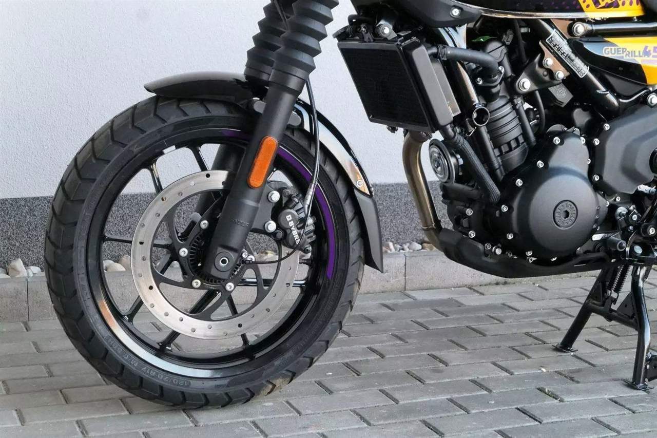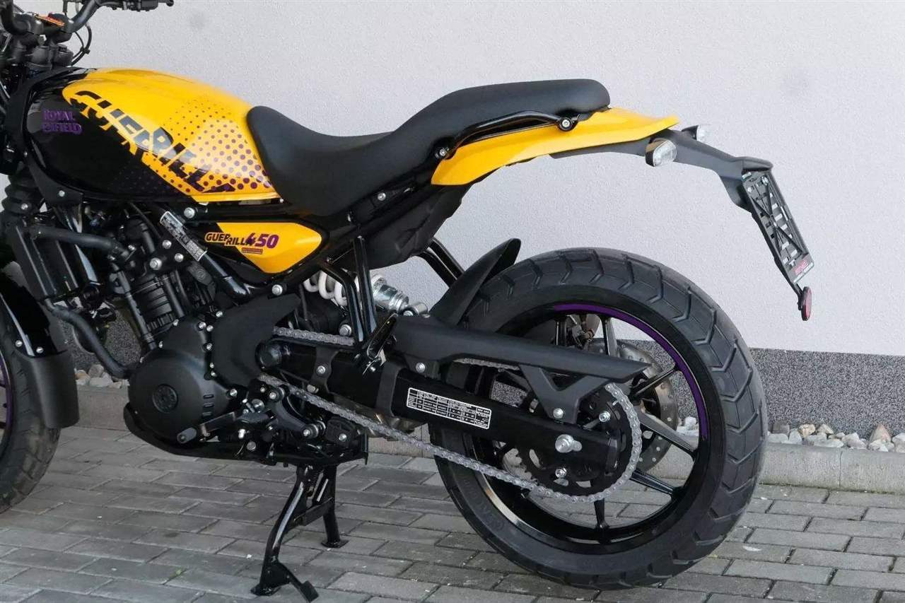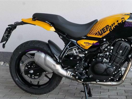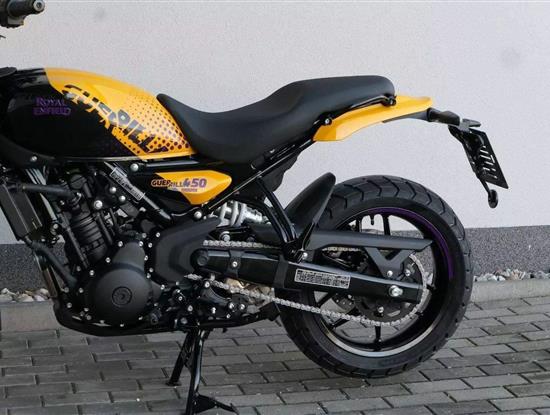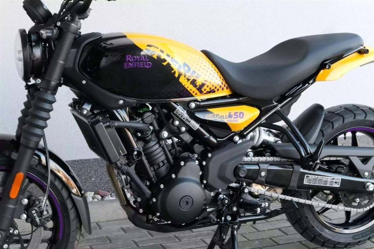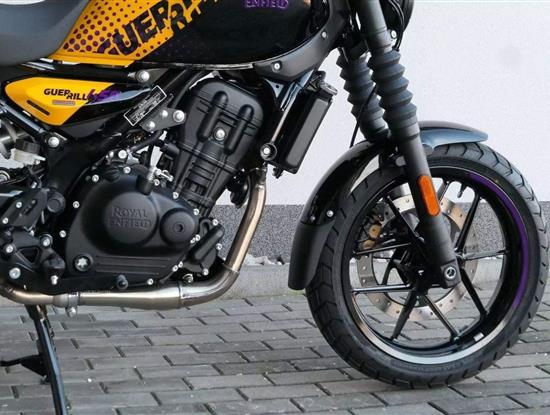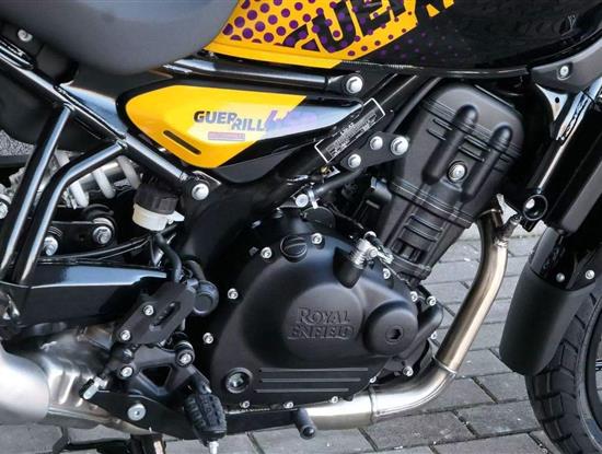 Z dosavadní modelové řady má Guerilla nejblíž Hunteru, působí ale moderněji a má i výrazně modernější techniku. Tak jako u aktuálního silnějšího Himalayanu 450 tvoří základ motorky trubkový páteřový rám, a v něm jako nosný prvek kapalinou chlazený jednoválec Sherpa o objemu 452 cm3. Relativně nový čtyřventil je mnohem výkonnější jednotkou než starší a menší vzduchem chlazené agregáty. Konkrétně nabídne rovných 40 koní v 8 000 otáčkách, a aby se to dobře pamatovalo tak i 40 Nm, které vrcholí v 5 500 otáčkách. Motor už má elektronický plyn a díky tomu i volitelné jízdní režimy – je ale poměrně jasné, který z dvojice „Eco“ a „Performance“ drtivá většina jezdců zvolí.