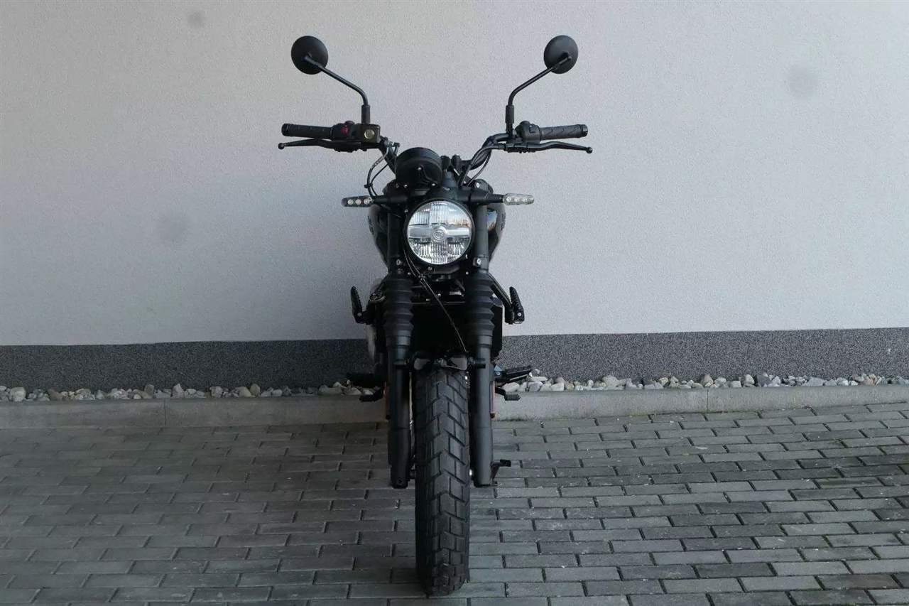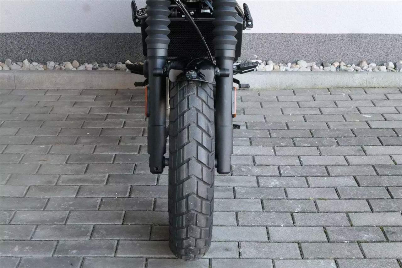 Na rozdíl od Himalayanu, nedělá si Guerrilla terénní ambice, byť některými prvky decentně připomíná, že je vlastně naháčo-scrambler – ve všech tiskových materiálech se pak objevuje populární termín „roadster“. Na teleskopických vidlicích jsou třeba prďácké retro prachovky, nicméně zdvih je jenom 140 milimetrů. Zadní vyosený centrál má potom 150 milimetrů.