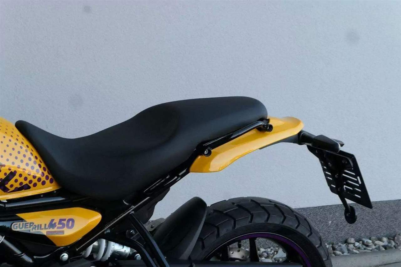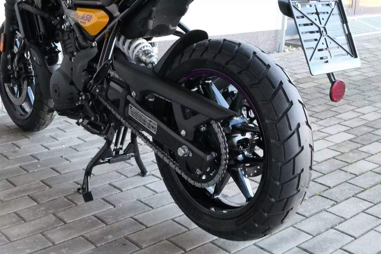 Kola jsou sedmnáctipalcová a Guerilla se chlubí přístupnou výškou sedla 780 milimetrů, stejně jako příjemnou pohotovostní hmotností 184 kilogramů. S ohledem na výkon a hmotnost jsou celkem dostačující i brzdy – vpředu jeden kotouč 310 milimetrů s dvoupístkovým brzdičem, vzadu 270 milimetrů s jednopístem. Do nádrže se vejde jenom skromných 11 litrů, na druhou stranu výrobce uvádí i skromnou tabulkovou spotřebu 3,39 litru na 100 kilometrů.