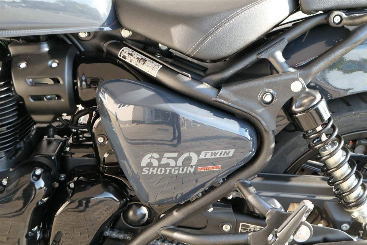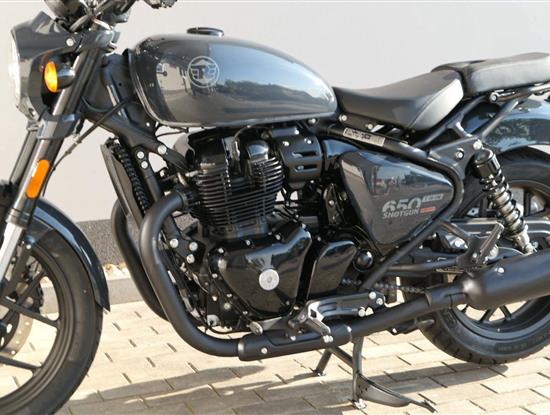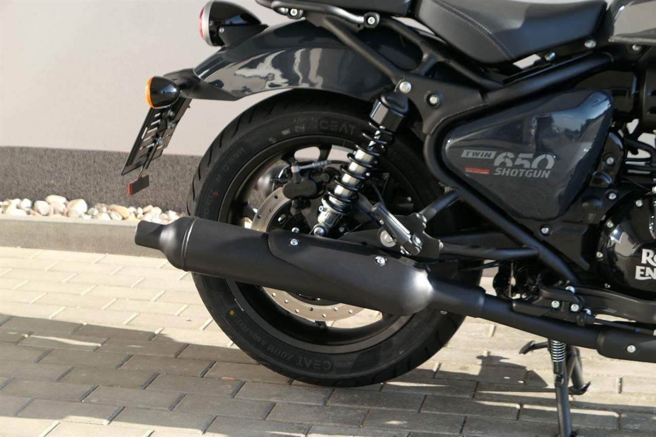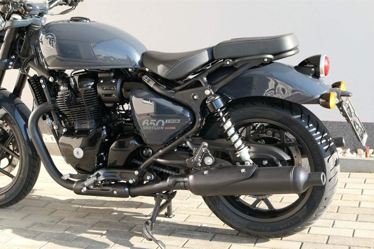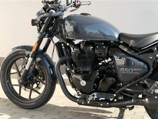 Nový Royal Enfield Shotgun 650 je motocykl, který je definován svým jezdcem. Jeho zcela nová karoserie a postoj jsou prázdným plátnem, které se vzpírá tradiční kategorizaci motocyklů a přebírá osobnost svého jezdce. Jeho modulární konstrukce umožňuje snadné přepínání mezi třemi režimy - od jednomístného přes dvoumístný až po cestovní vůz pro přepravu zavazadel. Otočením klíčku se odklopí sedadlo spolujezdce, což nabízí maximální flexibilitu. Těm, kteří hledají poutavou a agresivní jízdu, nebo těm, kteří hledají pohodovější zážitek, Shotgun 650 bez námahy vyhoví svou vzpřímenou a jistou jízdní pozicí, která podporuje obojí a přizpůsobuje se náladě a stylu jízdy jezdce. Kombinuje retro-futuristický design s moderními prvky. LED světlomet umístěný v nádherné neomoderní gondole na zakázku zůstává věrný estetice neo-retro fúze a zároveň nabízí lepší viditelnost. Motocykl je vybaven digitálně-analogovým sdruženým přístrojem, který je vybaven navigačním systémem Tripper a je navržen tak, aby poskytoval všechny informace, které potřebujete, když se vydáte na cestu. Je také vybaven nabíjecím portem USB, abyste měli svá zařízení na cestách stále nabitá.