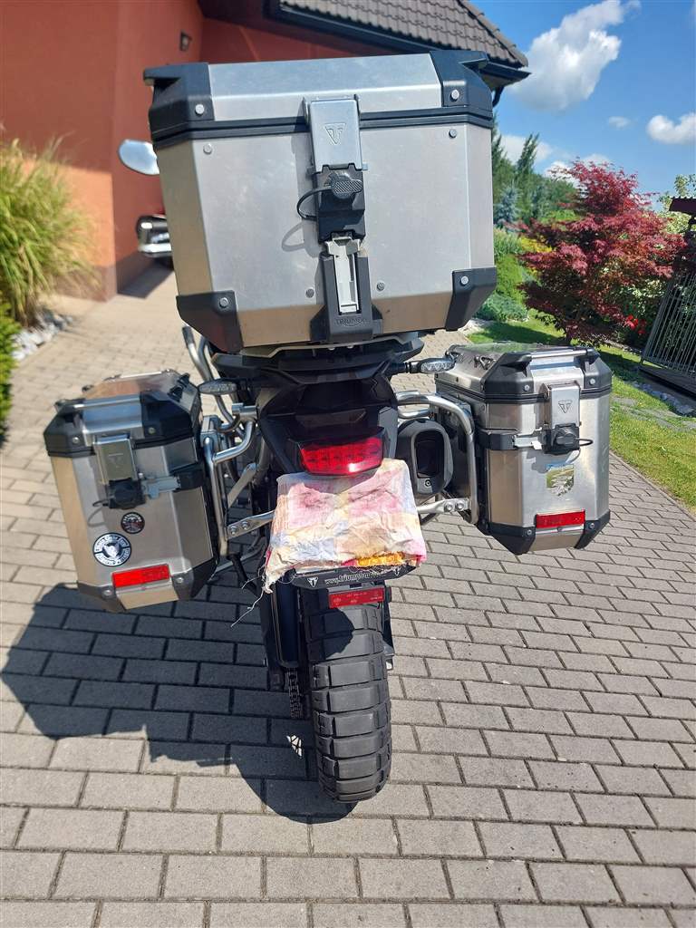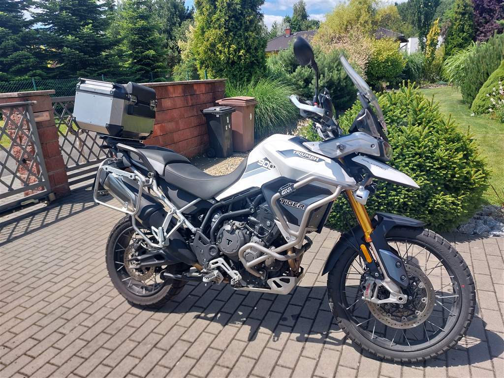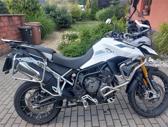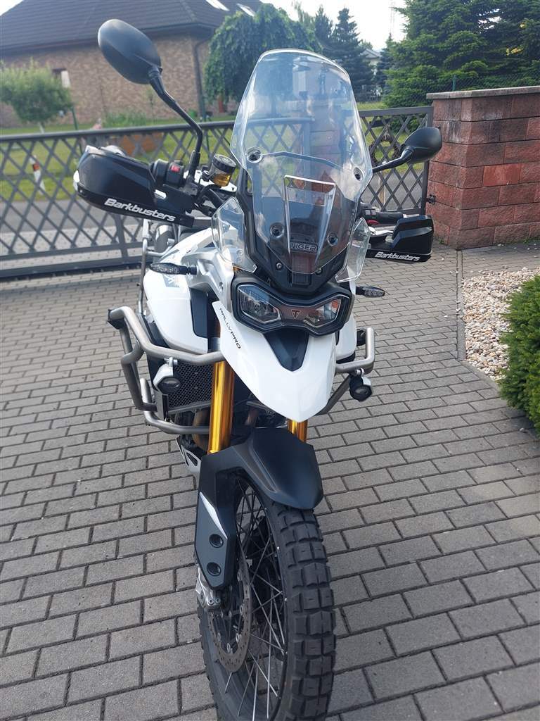 Prodám velice zachovalý motocykl Triumph Tiger Rally Pro, bílé barvy, modelový rok 2021, první majitel. Najeto 34 800 km. Pravidelně servisovaný v autorizovaném servisu Triumph Olomouc, dle pokynů výrobce – seřízení ventilů, výměna řetězu, výměna brzdové kapaliny (servisní knížka). Motorka obsahuje i tyto doplňky: originální AL kufry (2 boční + horní), AL doplňky (kryty chladiče, kryty rukojeti), horní padací rám, plastový zadní blatník. Výbava: barevný digitální přistroj (TFT) 5palcový, TK kontrola trakce, rychlořazení (Quickshifter +/-), 5 jízdních režimů (Rain, Road, Sport, Offroad, Offroad PRO), LED světlomet + LED denní svícení + bílé směrovky, vyhřívané rukojeti (3 stupně), vyhřívané sedadlo řidiče i spolujezdce, tempomat, ABS. Motorka nikdy nebouraná, velice zachovalá, užívaná na dlouhých cestách. Prodávám se zdravotních důvodů. Letos v dubnu proveden servis s výměnou oleje a filtrů, provedena výměna pneumatik Pirelli Scorpion Rally STR.