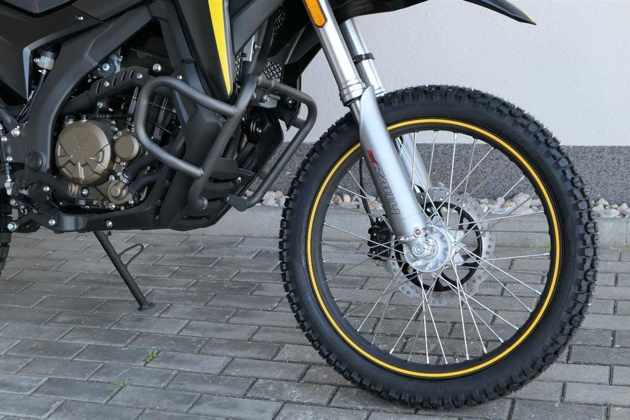 Míň je někdy víc. Řekli si vývojáři ve světoznámý fabrice Loncin a navrhli mě jako lehký a obratný enduro. S plnou nádrží mám pouhejch 158 kilo, takže se mnou snadno můžeš dělat psí kusy v terénu. Tomu nahrává i můj živej motor – čtyřtaktní jednoválcovej vodník vo objemu 292 cm3 a s výkonem přes 28 koní. Uvidíš, že se nezaleknu žádnýho stoupání a hravě si poradím se šutráky i s hlubším bahnem. Do karet nám bude hrát taky moje světlá vejška 280 mm.