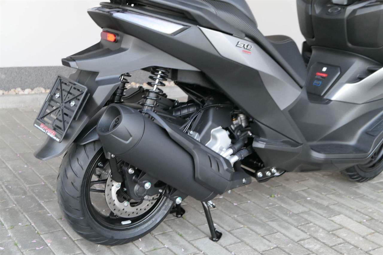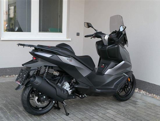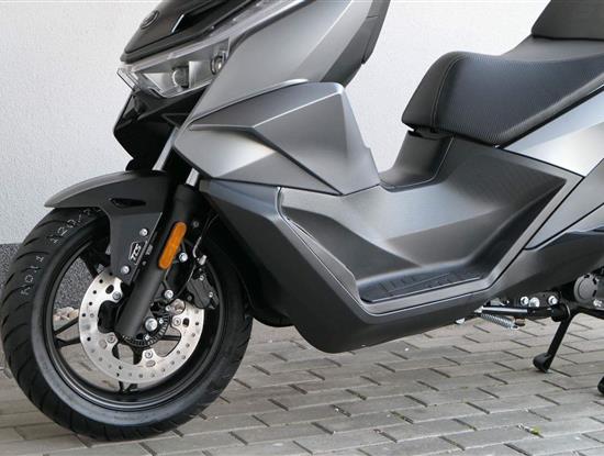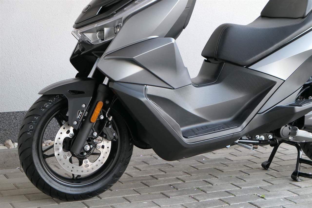 K tomu integrovaná palubní kamera s detektorem nárazu, kterej automaticky uloží záznam při nehodě. Elektrika je fajn, ale při brzdění spolíhám na starý dobrý železo, tedy dvoupístkový třmeny a kotouče. Ten vpředu má průměr 260 mm, zadní 240 mm. Na skútr slušný, co říkáš?